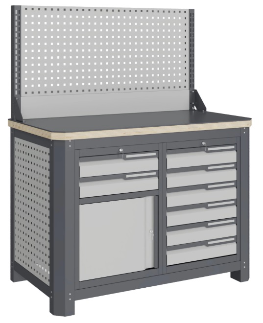 Состоит из столешницы шириной 1193 мм, рамы верстака, состоящей из опор, перемычек, боковых перфопанелей, небольшого модуля с ящиками S6 и S9 (два ящика и дверца), экрана с кронштейнами.