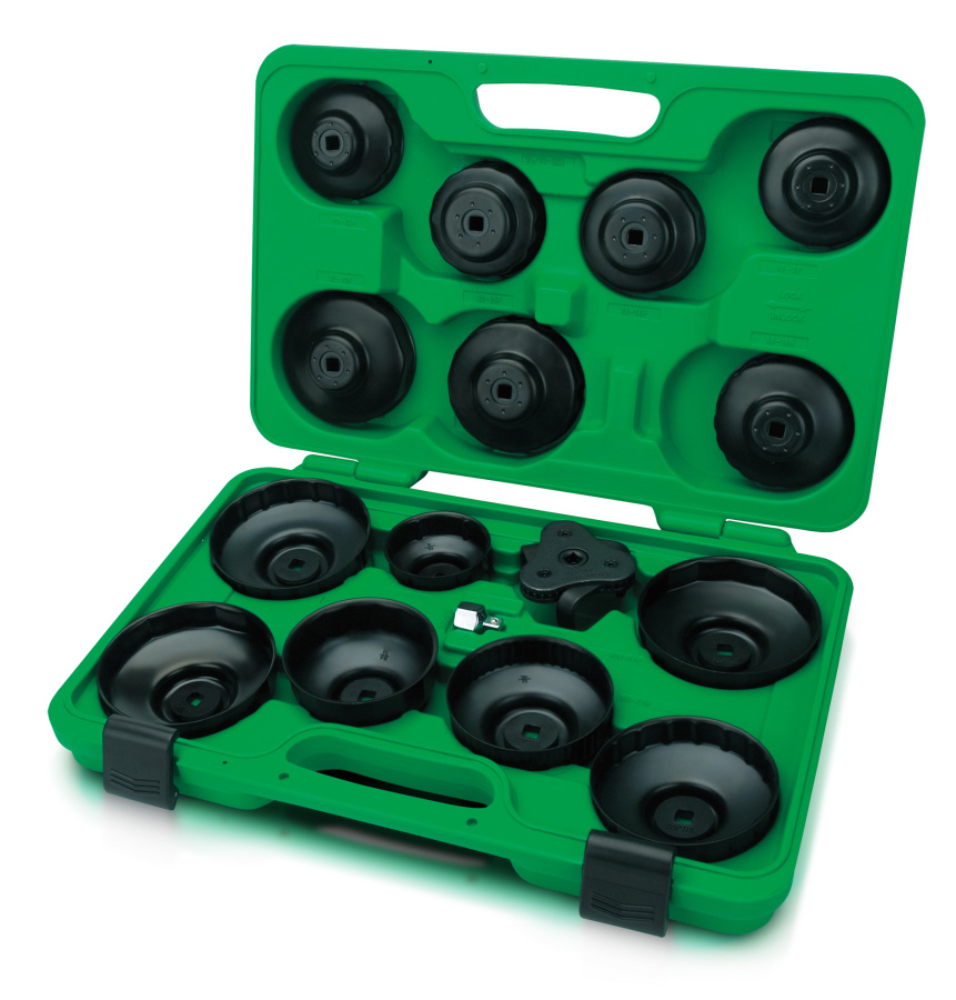 Съемники чашеобразной формы работают как гнездо, сводящее к минимуму возможность раздавливания фильтров, и подходит как для инструмента с присоединительным квадратом 3/8 дюйма, так и 1/2 дюйма с переходником, который поставляется в комплекте. Набор характерен наличием универсального съемника типа «краб», который может работать с фильтрами в диапазоне от 65 до 120 мм.